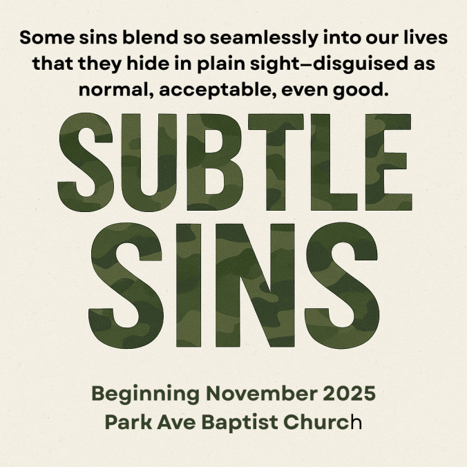 Not all sin shouts—some whispers. Some sins blend so seamlessly into our lives that they hide in plain sight, camouflaged as normal, acceptable, even good. Sin is anything we think, say, or do that displeases God. While some sins are easy to recognize because they’re blatantly wrong, others are far more dangerous precisely because they’re so easy to excuse. In this 4-week series, we’ll uncover those quiet, hidden attitudes, habits, and desires that take root in hearts that treasure something more than God. Together, we’ll invite Him to search our hearts, expose what’s been hiding beneath the surface, and lead us into the freedom Christ purchased for us at the cross—a real, transforming relationship that treasures Him above all else. (November 2025)